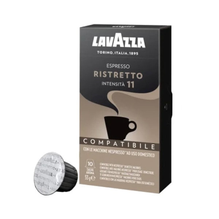 Lavazza Nespresso Espresso Ristretto 11 - насичена та ароматна кава в капсулах від відомого італійського бренду. Така форма випуску значно полегшує приготування напою. У кожній капсулі Неспресо Еспресо Рістретто 11 ви знайдете суміш арабіки (80%) та робусти (20%), вирощених на плантаціях Центральної та Південної Америки, а також Азії. Зерна були обсмажені до темної міри, щоб досягти максимально яскравого смаку та запаху. Напій радує легкою шоколадною гіркуватістю та карамельною насолодою. Такий бленд ідеальний зранку, коли потрібно зарядитись енергією та налаштуватись на робочий режим. Упаковка Nespresso Espresso Ristretto 11 є невеликою картонною коробкою, в якій ви знайдете 10 капсул з кавою від Лавацца.